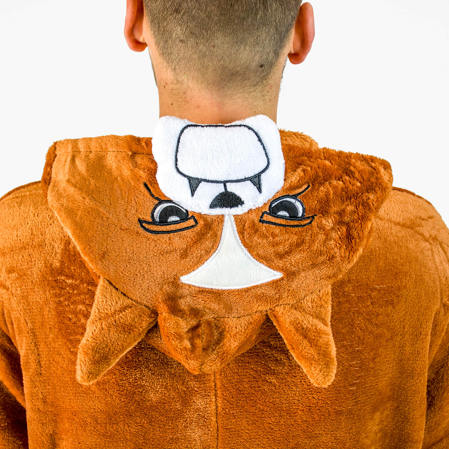 Kostium buldoga, a konkretniej- buldoga angielskiego o rudym umaszczeniu, pozwoli Ci się wcielić w tego budzącego respekt psa! Groźnie wyglądające kły, oraz czujne, sterczące uszy, sprawią że będziesz budził postrach w okolicy. Pamiętaj również o tym, że pieski to bardzo urocze stworzenia, pomimo strasznego wyglądu!