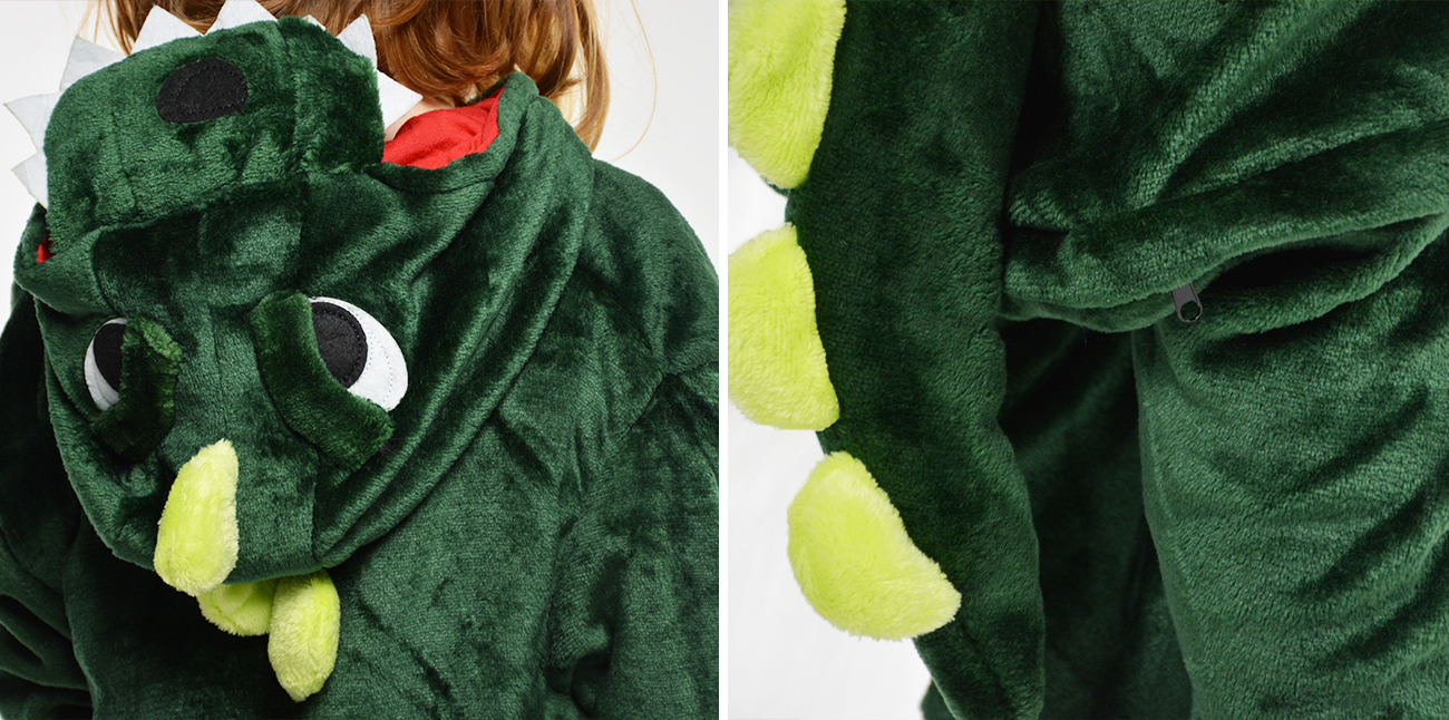 Kombinezon ma praktyczne zapięcie, które ułatwia szybkie zakładanie, a jego bajkowy charakter podkreśla kaptur z dużymi oczami, ząbkami i zabawnym dinozaurzym pyszczkiem. Na plecach znajdują się kolorowe kolce, które dodają mu wyjątkowego uroku i sprawiają, że każde dziecko poczuje się jak prawdziwy, mały odkrywca prehistorii!