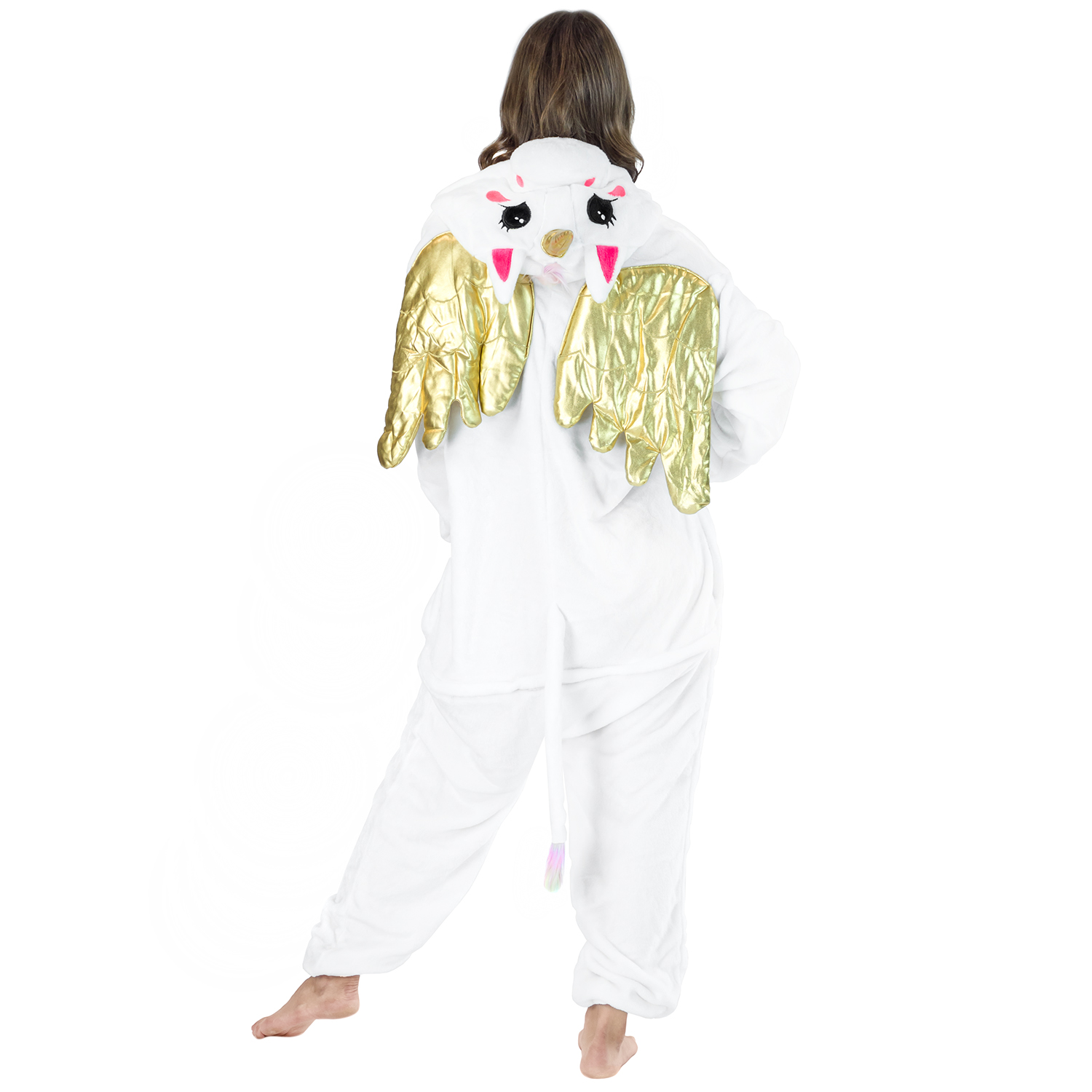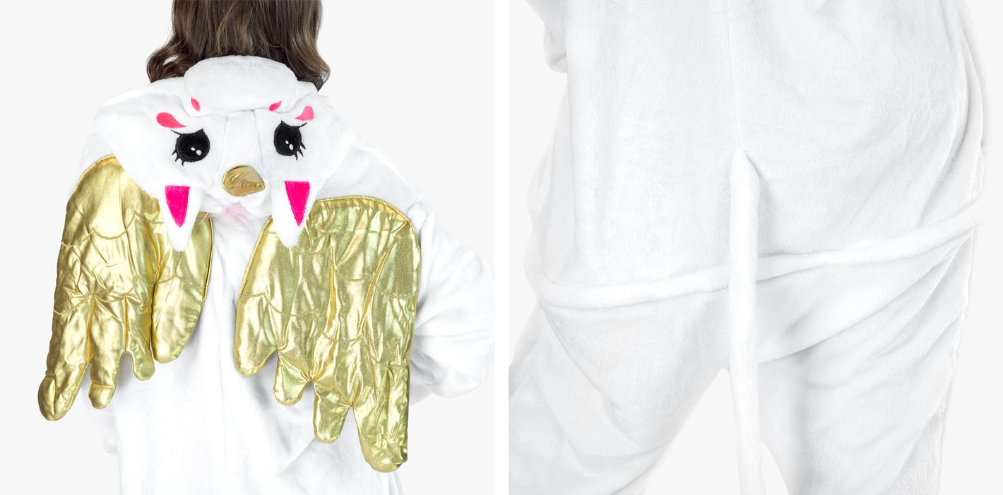 Wejdź w świat zabawy i wygody dzięki uroczemu kombinezonowi Biały Jednorożec! Uszyty z miękkiego, pluszowego materiału otuli Cię ciepłem i zapewni pełen komfort podczas relaksu w domu, przebieranych imprez czy spotkań ze znajomymi. Kombinezon wyróżnia się śnieżnobiałym kolorem, kapturem z rogiem, uszkami i uroczym pyszczkiem, a jego wyjątkową ozdobą są połyskujące złote skrzydła oraz kolorowa grzywa i ogon. Jednorożec, symbol magii i czystości, w tej odsłonie nabiera wyjątkowego, eleganckiego charakteru. To także doskonały pomysł na prezent, który zachwyci miłośników bajkowych i niecodziennych stylizacji. Dzięki starannemu wykończeniu i wysokiej jakości materiałowi kombinezon posłuży Ci przez długi czas. To połączenie zabawy, wygody i oryginalnego stylu!
